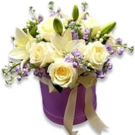 Wheeling Flowers address is at 19 W Dundee Rd in Wheeling IL. Signature Black Hat Box Lavender Roses. The zip code is 60090.
